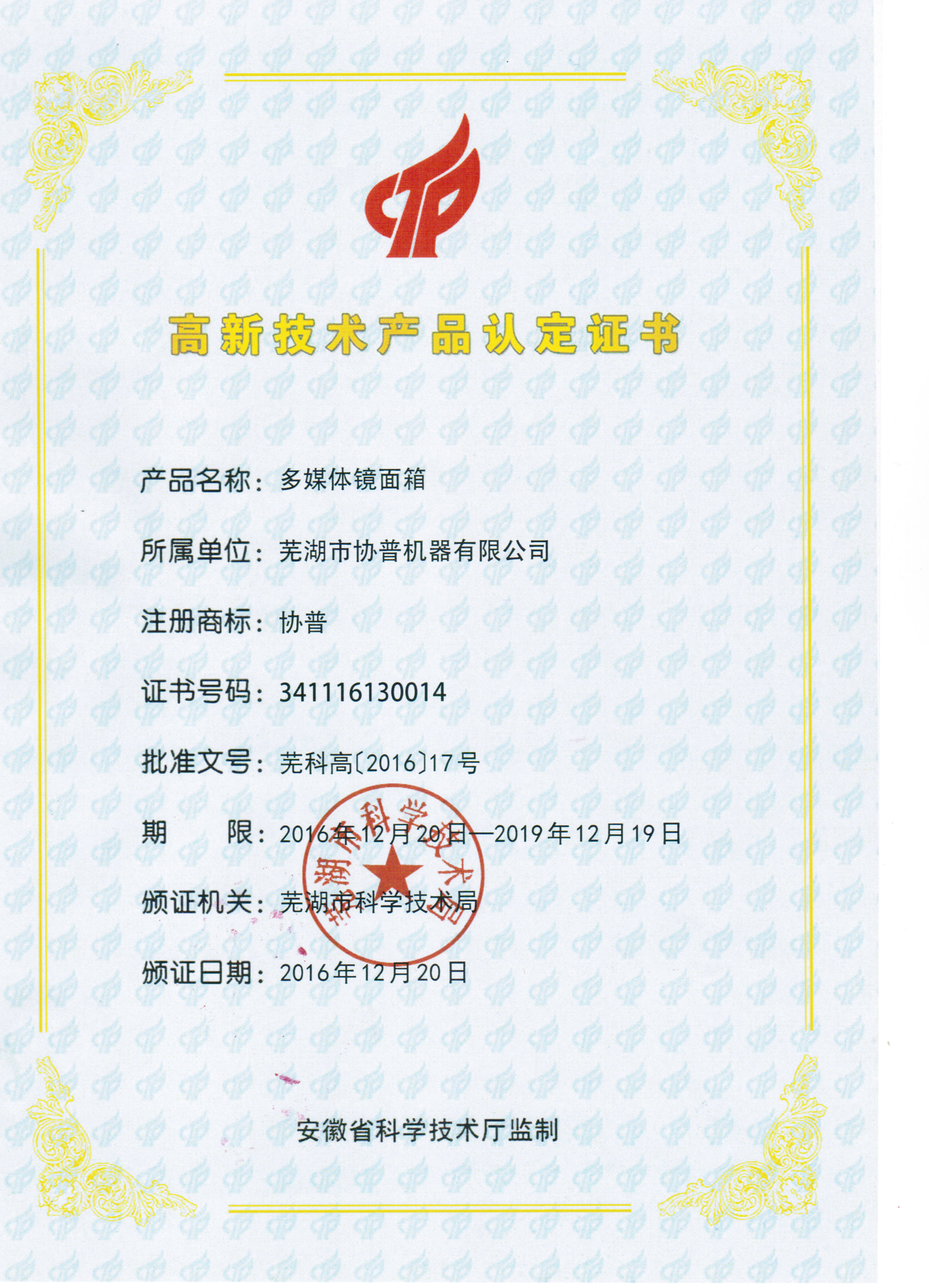 2016年9月,為提高產品知名度,我公司將一款新型高技術產品申報安徽省高新技術產品,經安徽省科技廳專家評審,于2016年12月正式通過審核。